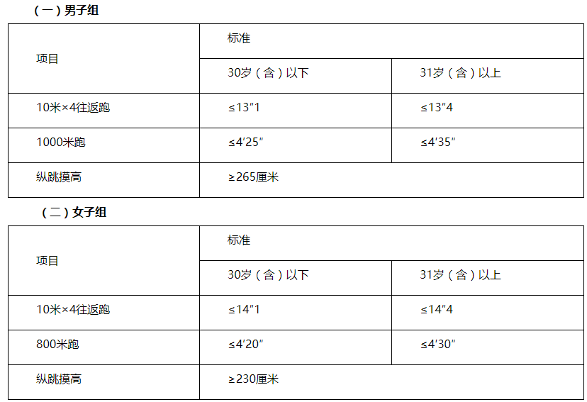 體能測(cè)評(píng)三項(xiàng)全部達(dá)標(biāo)方為合格。體能測(cè)評(píng)項(xiàng)目中,縱跳摸高的測(cè)試次數(shù)不超過3次,10米×4往返跑的測(cè)試次數(shù)不超過2次,長(zhǎng)跑項(xiàng)目(男子1000米、女子800米)的測(cè)試次數(shù)為1次。