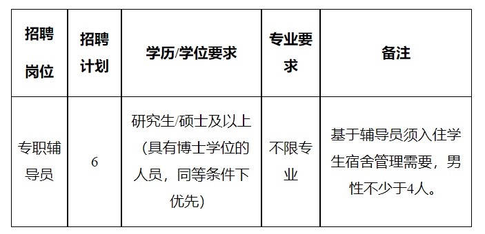 (四)年齡不超過30周歲,即1993年12月1日及之后出生;具有博士學(xué)位的,或具有高級(jí)職稱的,或有專職輔導(dǎo)員工作經(jīng)驗(yàn)且在各類輔導(dǎo)員職業(yè)能力競賽、輔導(dǎo)員評(píng)優(yōu)評(píng)先等活動(dòng)中獲得過省部級(jí)(含)以上獎(jiǎng)勵(lì)表彰者,年齡可放寬至35周歲,即1988年12月1日及之后出生。