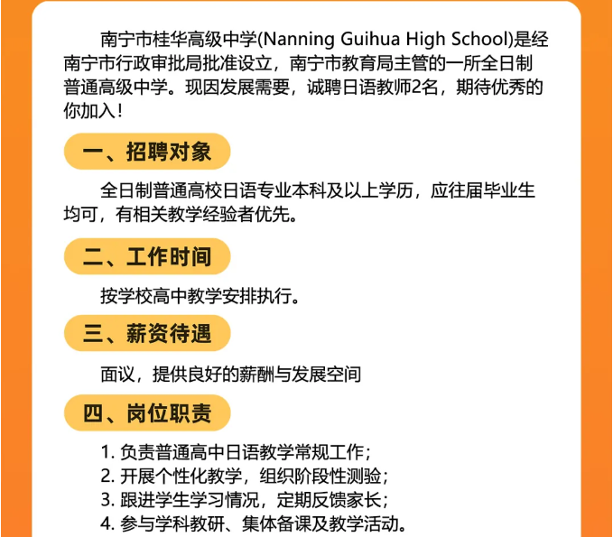 原文標題:南寧市桂華高級中學面向社會公開招聘2名日語老師的公告