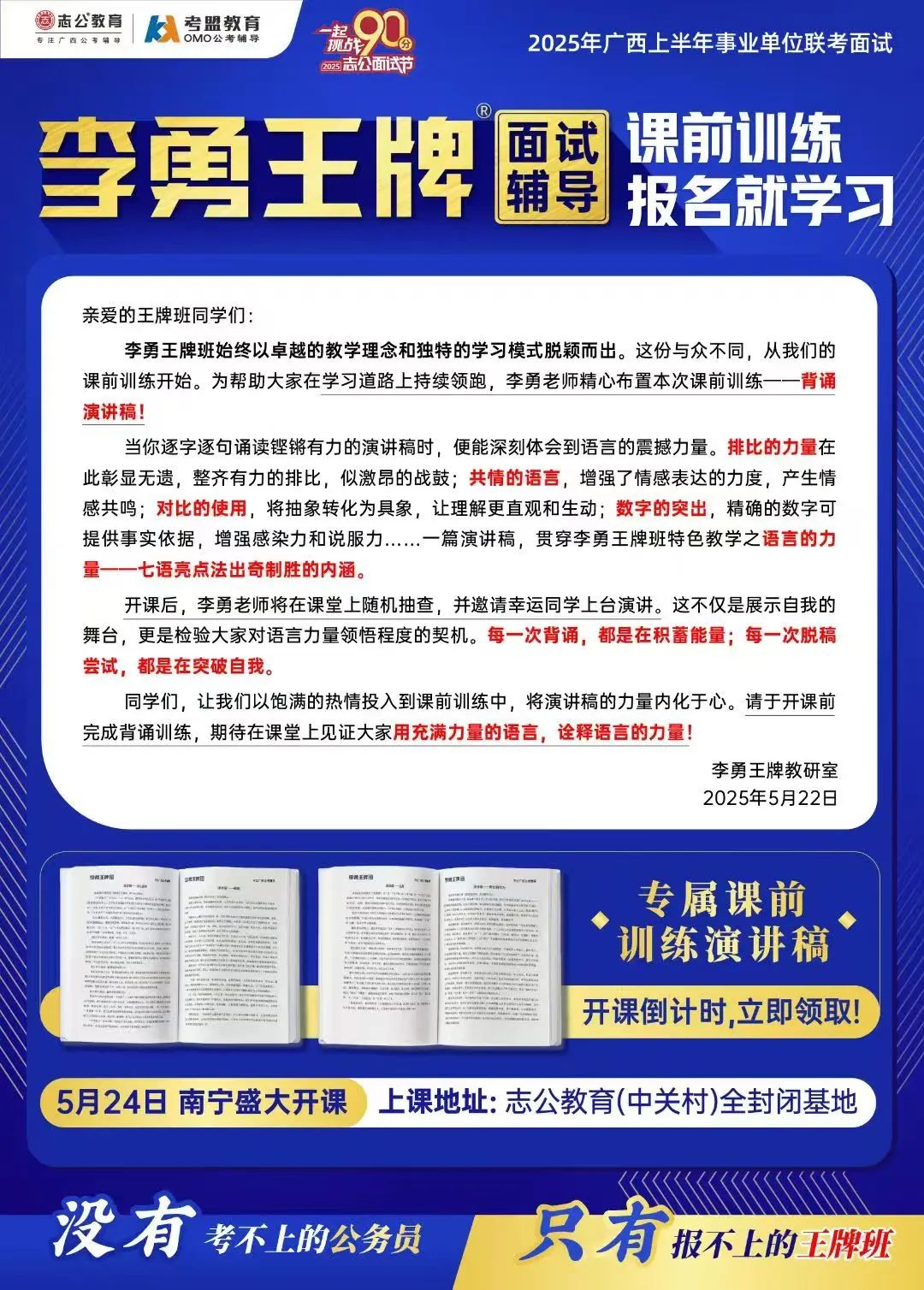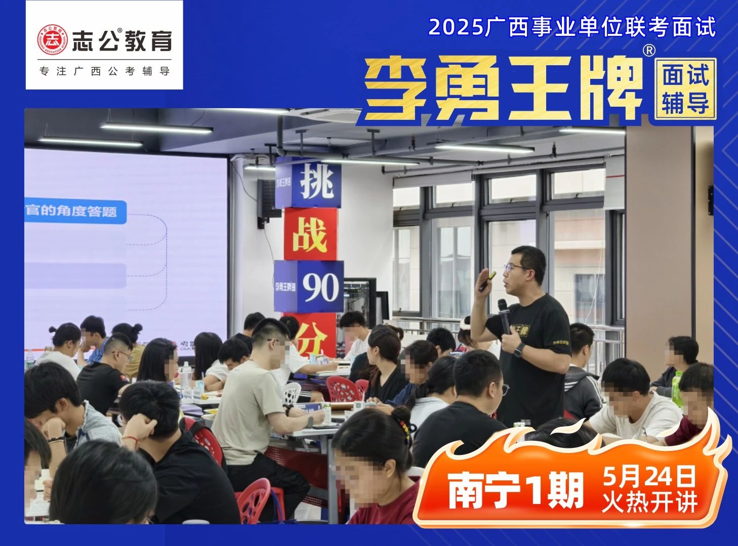 繼志公教育&李勇王牌®班教研室5月17日發(fā)布修改招生規(guī)則的通知后,各位未來“橘”長們,翹首以盼的時刻終于來啦!5月24日,志公教育李勇王牌®班——改革后的首個開班,在南寧火熱啟幕!現場學習氣氛爆棚,李勇老師與學員高頻互動,學員們直呼 “學到停不下來”!這不僅是一場面試特訓,更是一次思維與能力的雙重蛻變!