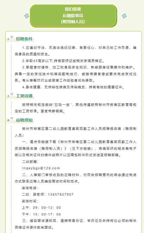 柳州市柳南區(qū)第二幼兒園教育集團(tuán)后勤工作人員招聘公告