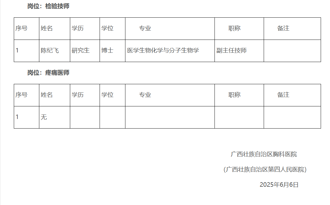 根據《自治區(qū)胸科醫(yī)院2025年度高層次人才公開招聘實名編制工作人員公告》要求,現將自治區(qū)胸科醫(yī)院2025年度高層次人才公開招聘實名編制工作人員報名通過資格審查人員名單公布如下: