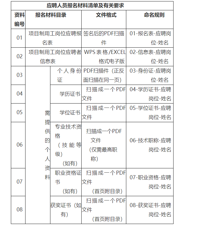 應(yīng)聘人員按照《應(yīng)聘人員報名材料清單及有關(guān)要求》提供相應(yīng)報名材料,壓縮成一個文件(文件名和郵件主題統(tǒng)一以本人姓名進行命名),發(fā)送至電子郵箱:515827308@qq.com。本次招聘僅接受電子郵件方式報名,報名材料一經(jīng)提交不能修改。