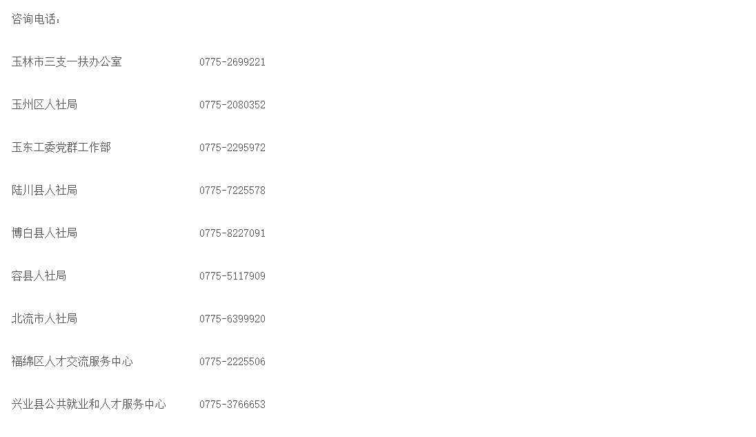 具體事宜可進入廣西高校畢業(yè)生“三支一扶”服務網(http://szyf.gxrc.com)查詢政策或向玉林市“三支一扶”辦公室電話咨詢。