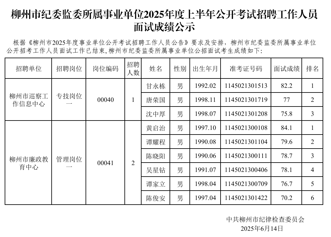 柳州市紀(jì)委監(jiān)委所屬事業(yè)單位2025年度上半年公開考試招聘工作人員面試成績公示