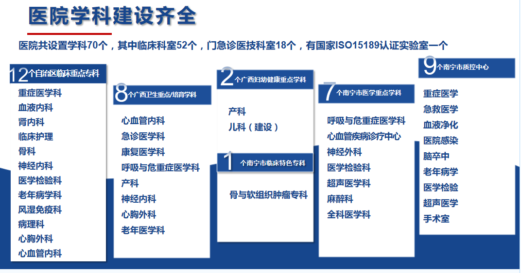 南寧市第一人民醫(yī)院(南寧市兒童先天性心血管疾病研究所、南寧市呼吸道疾病研究所、廣西醫(yī)科大學(xué)第五臨床醫(yī)學(xué)院、廣西醫(yī)科大學(xué)第五附屬醫(yī)院)始建于1914年,是一家擁有百年歷史的國家三級甲等綜合性醫(yī)院。醫(yī)院設(shè)有52個(gè)臨床病區(qū),18個(gè)門診醫(yī)技科室,總開放床位1912張(含分院)。醫(yī)院是國家高級認(rèn)知中心建設(shè)單位及國家神經(jīng)介入建設(shè)中心、國家ISO15189醫(yī)學(xué)檢驗(yàn)認(rèn)證機(jī)構(gòu),國家聯(lián)盟中心認(rèn)證的胸痛中心、卒中中心;擁有廣西臨床重點(diǎn)??疲ê嘤?2個(gè)、自治區(qū)醫(yī)療衛(wèi)生重點(diǎn)學(xué)科(含培育)8個(gè)、自治區(qū)婦幼健康服務(wù)重點(diǎn)學(xué)科(含建設(shè))2個(gè)、南寧市醫(yī)學(xué)重點(diǎn)學(xué)科7個(gè)、南寧市臨床特色優(yōu)勢專科1個(gè),南寧市質(zhì)控中心9個(gè)。醫(yī)院是國家衛(wèi)健委創(chuàng)面修復(fù)能力建設(shè)和繼續(xù)教育中心教學(xué)基地、國家級住院醫(yī)師規(guī)范化培訓(xùn)培訓(xùn)基地,廣西醫(yī)科大學(xué)碩士研究生培養(yǎng)基地,同時(shí)是暨南大學(xué)共建醫(yī)學(xué)教育基地、第十批廣西博士后創(chuàng)新實(shí)踐基地;醫(yī)院還具備國家藥物臨床試驗(yàn)機(jī)構(gòu)資質(zhì)(含I期研究室);醫(yī)院醫(yī)學(xué)實(shí)驗(yàn)中心獲批廣西科技廳重點(diǎn)實(shí)驗(yàn)室“廣西智慧精準(zhǔn)醫(yī)學(xué)實(shí)驗(yàn)室”,是南寧市衛(wèi)健系統(tǒng)唯一的省級重點(diǎn)建設(shè)實(shí)驗(yàn)室。2019年在市委市政府支持下,成立南寧市第一人民醫(yī)院醫(yī)療集團(tuán)?,F(xiàn)有27家成員單位,形成“1+4+22”(中心醫(yī)院+4家二級醫(yī)院+22家基層衛(wèi)生及養(yǎng)老機(jī)構(gòu))一體化格局,推行“三二一”運(yùn)營管理模式,逐步構(gòu)建全生命周期健康管理鏈。