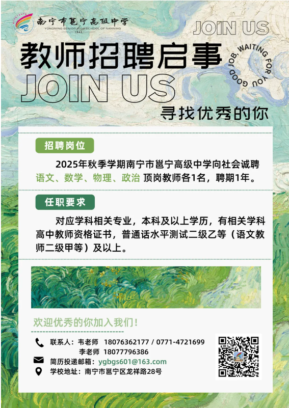 原文標(biāo)題:南寧市邕寧高級中學(xué)2025年秋季學(xué)期教師招聘啟事