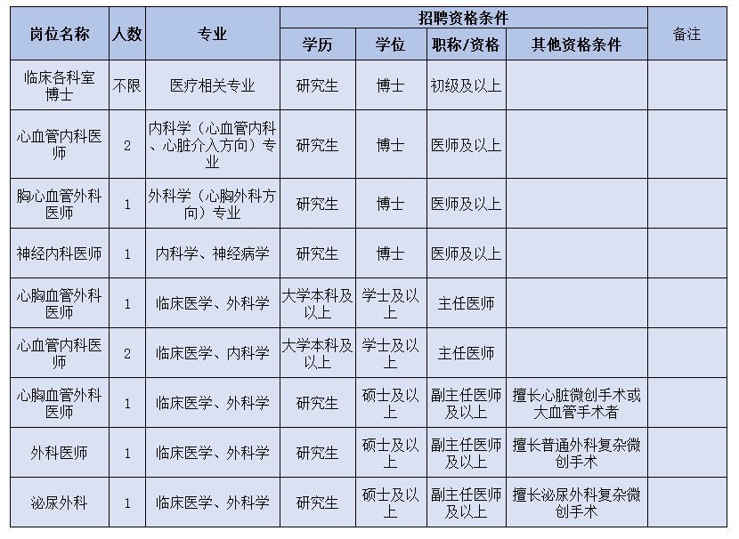 ③列入醫(yī)院人才引進目錄或醫(yī)院根據(jù)??瓢l(fā)展需要的崗位人才,人才資格條件按特殊情況辦理,采用一人一議。