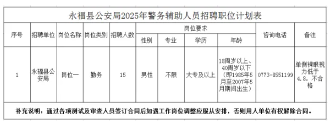 計(jì)劃招聘警務(wù)輔助人員15名。具體崗位、招聘人數(shù)、資格條件詳見《永福縣公安局輔警招聘計(jì)劃表》。