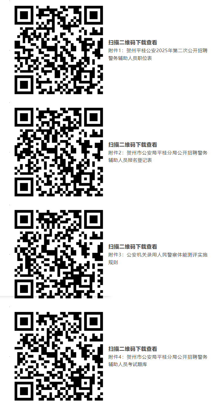 報考人員自2025年7月21日起,可通過賀州市公共就業(yè)和人才服務(wù)中心“賀州市微就業(yè)”官方微信(gxhzjy)、賀州市公安局平桂分局“平桂警方”官方微信(pggafj)查閱招聘簡章及《職位計劃表》(附件1)等相關(guān)招聘信息。
