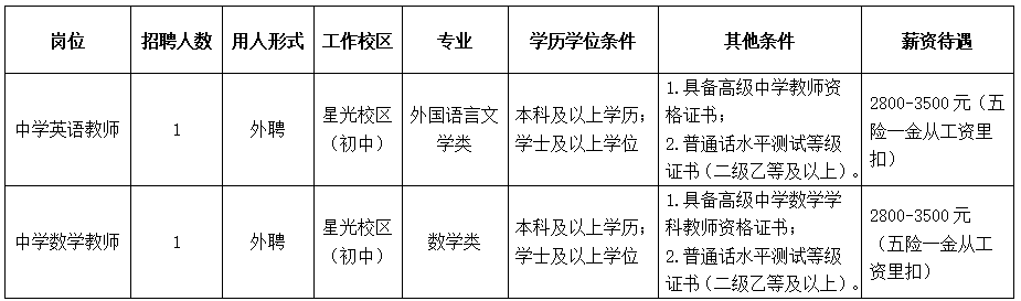 根據學校工作需要,南寧市第十中學星光校區(qū)(初中部)面向社會招聘教職工,具體崗位如下: