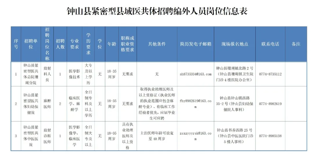 5.崗位具體信息及要求詳見附件1《鐘山縣緊密型縣域醫(yī)共體招聘編外人員崗位信息表》(如下圖)。