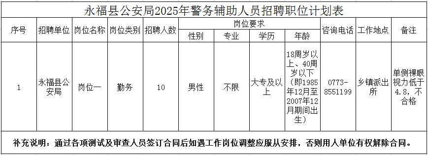 計劃招聘警務輔助人員10名。具體崗位、招聘人數(shù)、資格條件詳見《永福縣公安局輔警招聘計劃表》。
